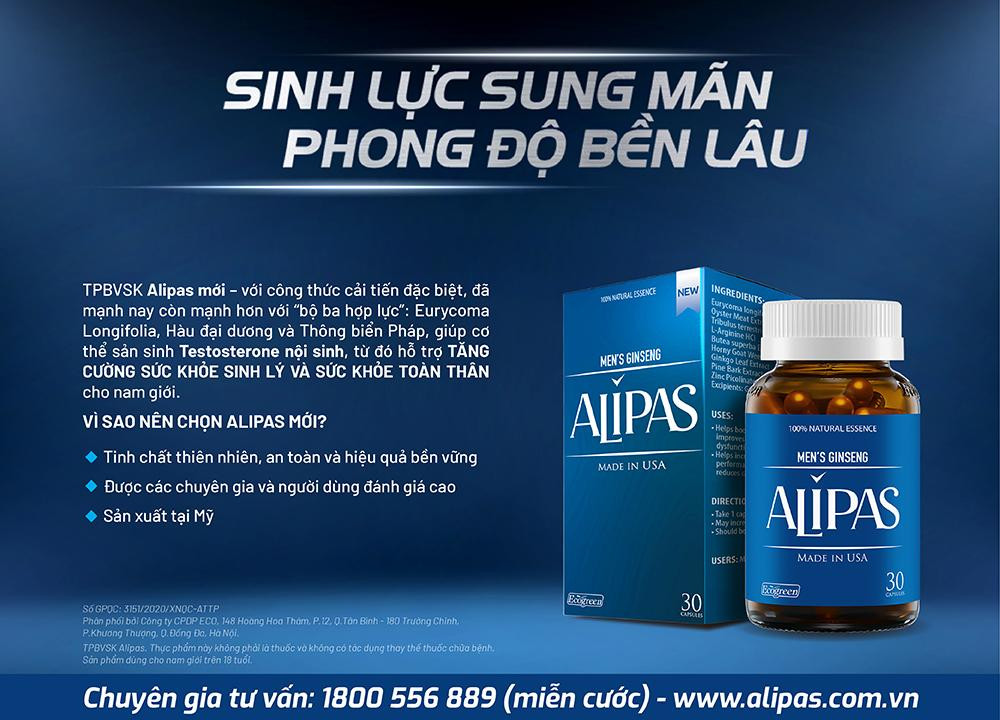 Ngày nay, với sự phát triển của công nghệ, các nhà khoa học có thể phát triển và tinh chiết các dưỡng chất quý từ thiên nhiên, cung cấp cho cơ thể những thành phần thiết yếu nhằm nâng cao sức khỏe toàn thân và tăng cường sinh lý. Trong đó, Eurycoma Longifolia, chiết xuất Thông biển Pháp và tinh chất Hàu đại dương (có trong Alipas) có tác dụng thúc đẩy cơ thể tăng sản sinh Testosterone và Nitric Oxide nội sinh. Trong đó, Testosterone tham gia vào quá trình tạo cơ bắp và các đặc tính nam như hình thể, giọng nói, lông tóc, nâng cao sức khỏe thể chất và tinh thần. Còn Nitric Oxide giúp nâng cao sức khỏe tim mạch, tăng cường trao đổi chất và hoạt động của cơ bắp. Về sức khỏe sinh lý, cả hai thành phần này hỗ trợ nam giới tăng cường ham muốn tình dục, cải thiện rối loạn cương, tăng cường sinh lực phái mạnh.