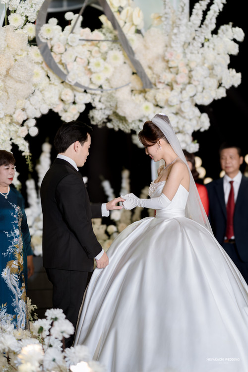 | Ngọc Anh được bố dẫn vào lễ đường trong tiệc cưới. Sau đó, cặp đôi cùng thực hiện các nghi thức truyền thống như trao nhẫn, uống rượu giao bôi, thề nguyện... Ảnh: Nupakachi Wedding. |