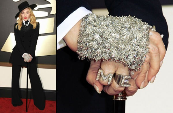 Trong trang phục được thiết kế bởi Ralph Lauren, Madonna chọn lựa bộ móng kẻ nhũ với tông màu hồng nude nữ tính, kết hợp với những chiếc nhẫn và đôi găng tay lấp lánh đầy cá tính và nổi bật.