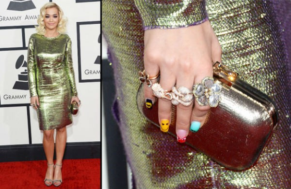 Cô nàng Rita Ora phá cách và màu mè với bộ móng hình mặt cười đầy màu sắc tại lễ trao giải Grammy. Cô chọn cho mình trang phục kín đáo nhưng vẫn nổi bật, quyến rũ.