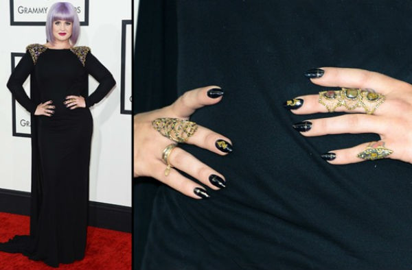 Những đường kẻ viền mảnh màu vàng trên nền móng tay đen và tạo điểm nhấn ở một, hai ngón tay đúng như phong cách của Kelly Osbourne. Màu sắc này thêm sang trọng khi cô kết hợp cùng trang sức trên tay, bộ đầm màu đen quý phái và mái tóc ombre cá tính.