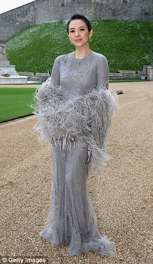 "Hoa đán" Chương Tử Di xinh đẹp trong chiếc đầm xám và khăn lông quý phái. Cô vinh dự là sao châu Á duy nhất góp mặt tại sự kiện