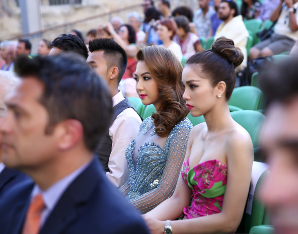 Jennifer Chung và Quách An An chăm chú theo dõi chương trình từ hàng ghế khán giả của nhà hát cổ kính, nằm ở ngoài trời.