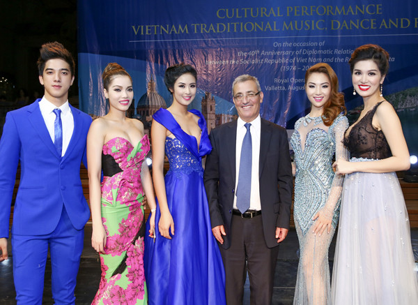 Tổng thống Malta (giữa), thị trưởng thành phố Valleta (trái) và đại diện Đại sứ quán Việt Nam (phải) cũng đến xem show diễn.