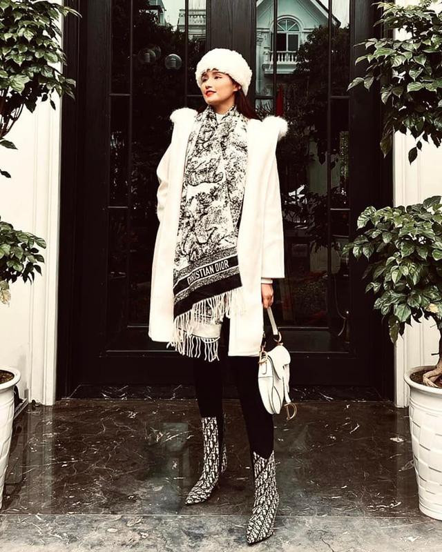Trong khi nhiều diễn viên chọn trang phục truyền thống cho ngày Tết thì Lã Thanh Huyền lại lộng lẫy như bà chúa tuyết với áo khoác dạ và mũ lông trắng. Chỉ cần nhìn vào set đồ của Lã Thanh Huyền là thấy ngay “nữ hoàng đồ hiệu” của dàn diễn viên phim VTV.