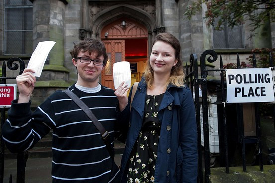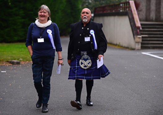 Hai cử tri ủng hộ Scotland tách thành một quốc gia độc lập tới điểm bỏ phiếu tại nhà thờ St. Martins