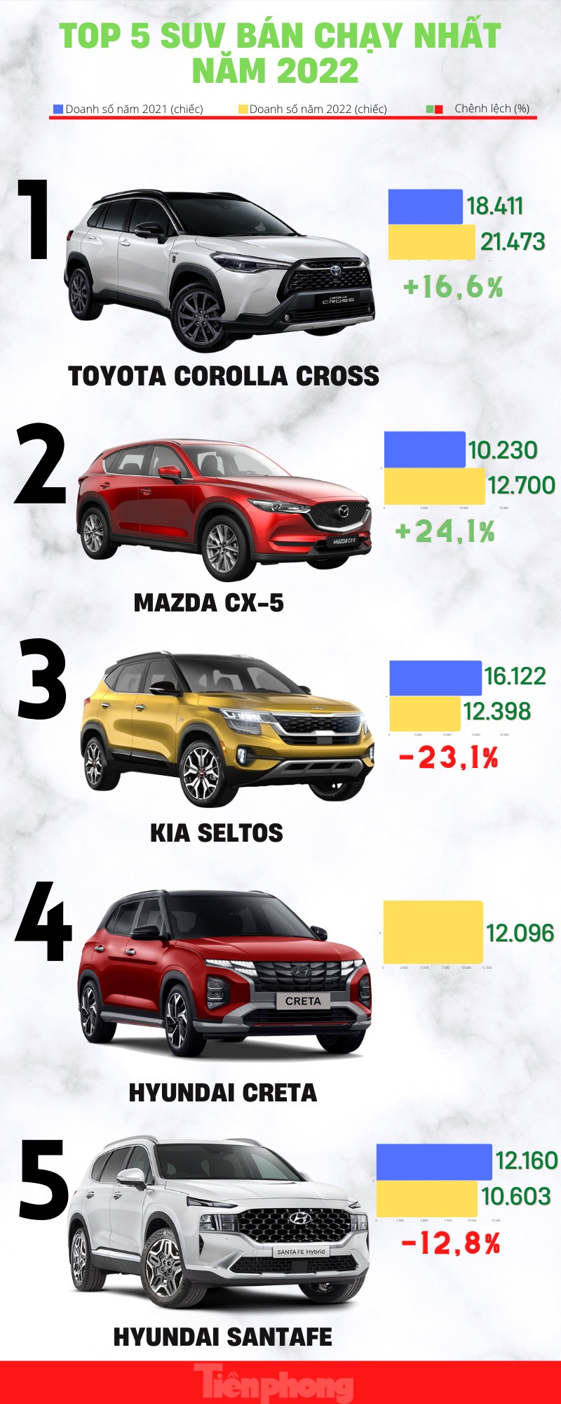 TPO - Tất cả xe gầm cao bán chạy nhất nằm 2022 đều thuộc phân khúc crossover. Đáng chú ý, dù mới mở bán vào năm 2022, Hyundai Creta đã đứng ở vị trí thứ tư trong danh sách SUV bán chạy, vượt mặt "người anh em" Santa Fe.