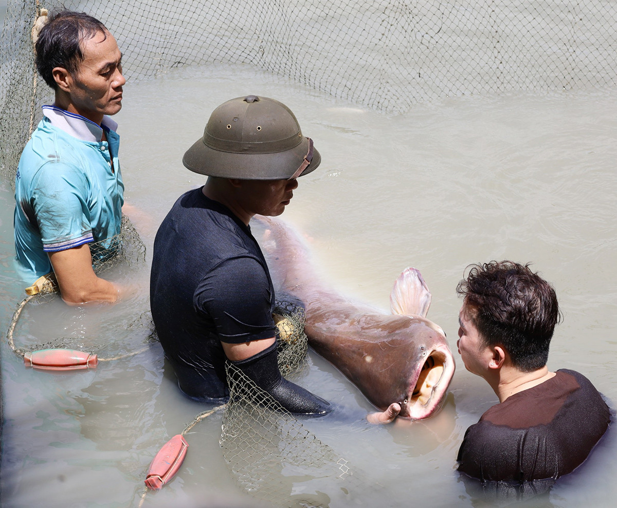 Một ngày đầu tháng 6, vợ chồng chị Lê Hồng Cầm (35 tuổi, ngụ huyện Phong Điền, TP Cần Thơ) cùng nhiều người kéo ao kiểm tra đàn cá tra dầu "khủng" mỗi con nặng từ 100kg - 150kg. Đây được xem là đàn cá tra dầu lớn nhất miền Tây. Mỗi con phải 3-4 người khiêng mới nổi.