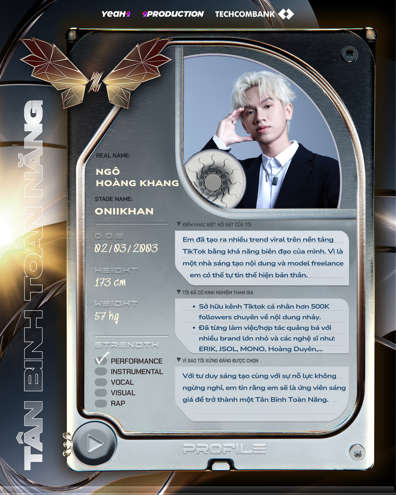 Bên cạnh hoạt động solo, ONIIKHAN từng hợp tác với nhiều nghệ sĩ như ERIK, JSOL, MONO,... và tham gia quảng bá cho các thương hiệu lớn nhỏ. Với kinh nghiệm hoạt động mẫu ảnh, biên đạo và sáng tạo nội dung, ONIKHAN có "profile" đáng gờm trong dàn thí sinh ứng tuyển Tân Binh Toàn Năng.