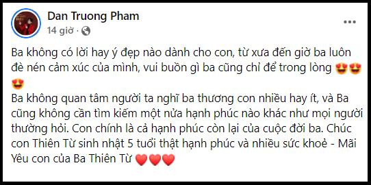 Cụ thể, trước mắt, giọng ca Kiếp ve sầu sẽ không đi thêm bước nữa mà dành trọn thời gian, tình cảm cho cậu con trai nhỏ. Anh chia sẻ: "Ba không quan tâm người ta nghĩ ba thương con nhiều hay ít, và ba cũng không cần tìm kiếm một nửa hạnh phúc nào khác như mọi người thường hỏi. Con chính là cả hạnh phúc còn lại của cuộc đời ba. Mãi yêu con của ba - Thiên Từ".
