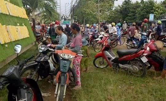 Hàng trăm người dân hiếu kì tụ tập trước trụ sở UBND xã Bình Thắng vì tin đồn bắt cóc trẻ em.