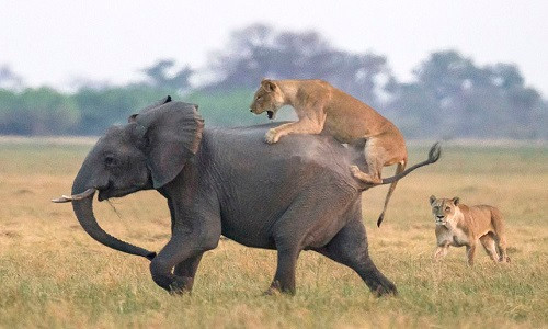Loạt ảnh của nhiếp ảnh gia người Anh James Gifford ghi lại khoảnh khắc một con sư tử cái phục kích và nhảy lên lưng tấn công con voi nhỏ trong vườn quốc gia Chobe ở Botswana. Sư tử cái không đủ mạnh để ghì con mồi xuống đất. Trước khi nó kịp gọi đồng loại tới giúp sức, cả đàn voi đã kéo đến bảo vệ con voi non.