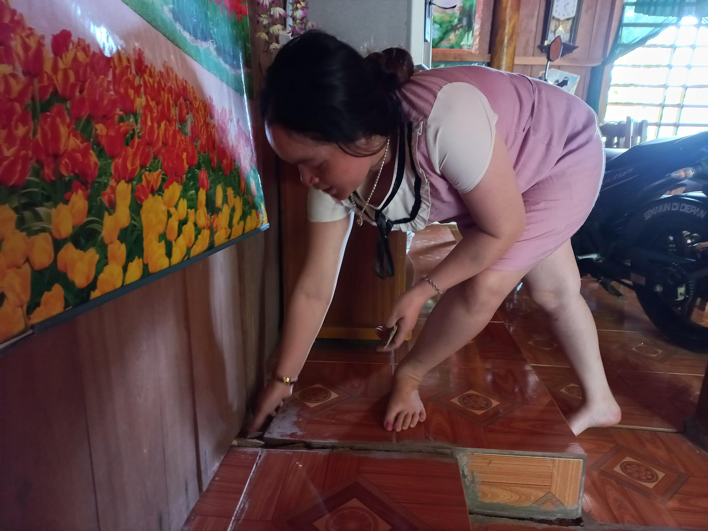 | Nền nhà của người dân thôn 2 xã Phước Thành (Phước Sơn, Quảng Nam) bị nứt, sụt sâu tiềm ẩn nhiều nguy cơ. Ảnh: Nguyễn Thành |