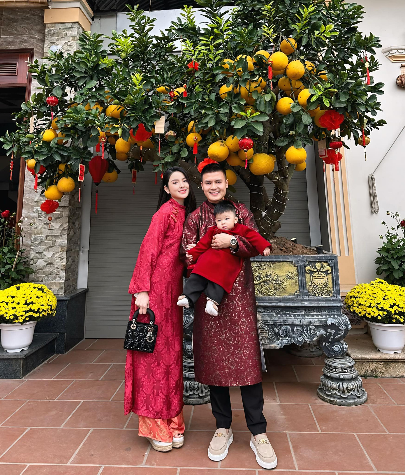 | Gia đình nhỏ của đội trưởng Duy Mạnh chụp hình ngày Tết. "Công chúa béo" Quỳnh Anh mặc trang phục giản dị, tươi tắn bên chồng và các con. |