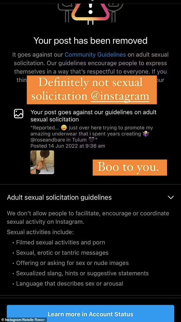 Natalie Roser đã chia sẻ hình ảnh bị Instagram thông báo xóa ảnh lên Story của Instagram cá nhân và khẳng định đây không phải là hình ảnh "gạ gẫm tình dục"