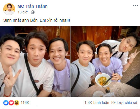 Cụ thể, sau khi đăng tải hai bức ảnh bên cạnh Hoài Linh và Dương Triệu Vũ trên Facebook kèm chú thích: “Sinh nhật anh Bốn”, Trấn Thành nhanh chóng nhận được hơn 118 nghìn lượt yêu thích của các fans.