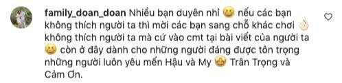 Không thể im lặng trước sự khiếm nhã của anti-fan, Đoàn Văn Hậu lên tiếng đáp trả: “Nhiều bạn duyên nhỉ, nếu các bạn không thích người ta thì mời các bạn sang chỗ khác chơi. Không thích người ta mà cứ vào bình luận tại bài viết của người ta, còn ở đây dành cho những người đáng được tôn trọng, những người luôn yêu mến Hậu và My. Trân trọng và cảm ơn”.