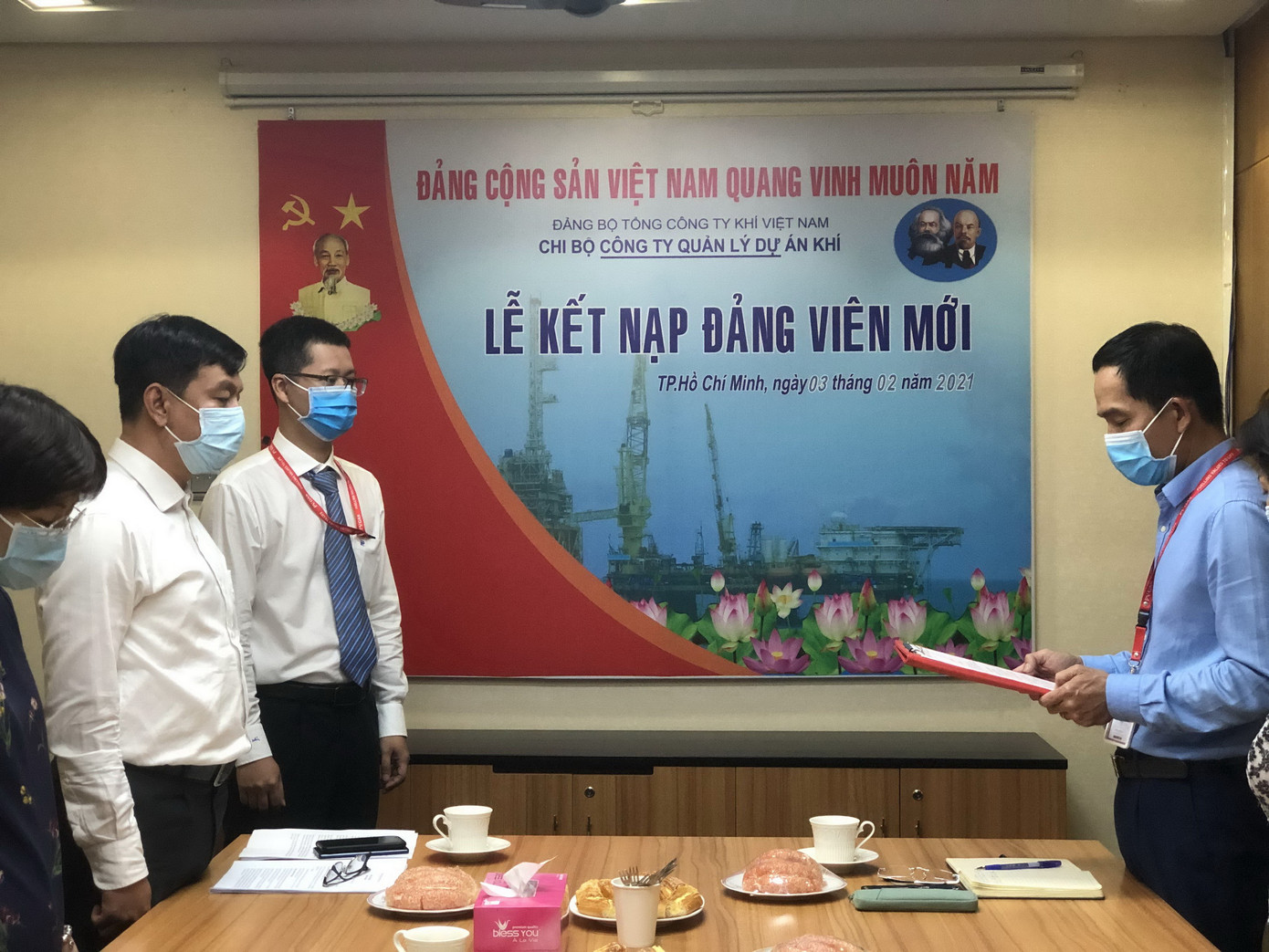Thực hiện Quyết định số 50-QĐ/ĐU ngày 19/01/2021 của Ban Thường vụ Đảng ủy Tổng công ty Khí Việt Nam, tại Tòa nhà PV GAS TOWER, Chi bộ Công ty Quản lý Dự án Khí (DAK) đã long trọng tổ chức Lễ kết nạp đảng viên mới cho quần chúng Nguyễn Đồng Tuấn - Trưởng Phóng Kinh tế hợp đồng.