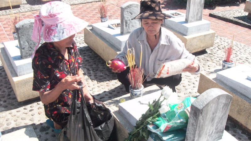 Thân nhân chăm sóc phần mộ liệt sỹ.