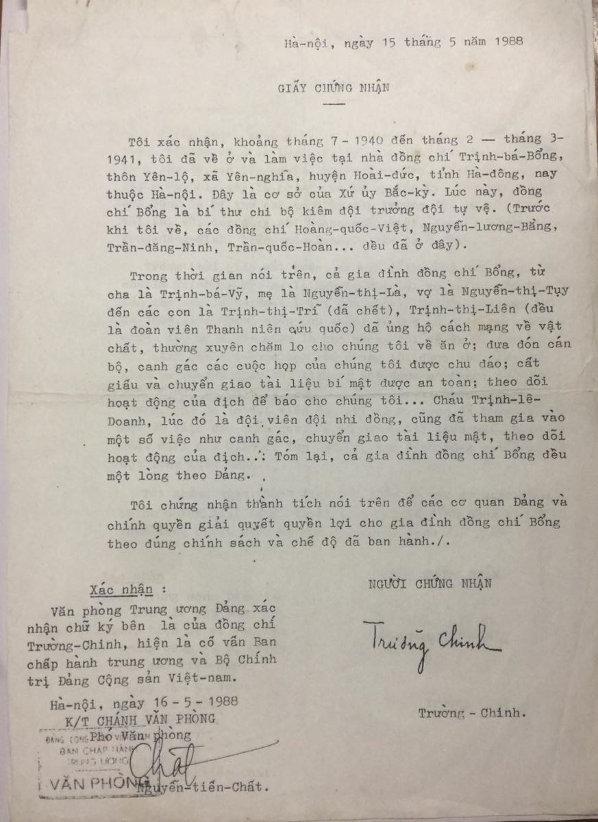 “Tôi xác nhận, khoảng tháng 7 năm 1940 đến tháng 2, tháng 3 năm 1941, tôi đã về ở và làm việc tại nhà Đồng chí Trịnh Bá Bổng (con trai Cụ Trịnh Bá Vỹ) (…) Trước khi tôi về, các Đồng chí Hoàng Quốc Việt, Nguyễn Lương Bằng, Trần Đăng Ninh, Trần Quốc Hoàn... đều đã ở đây. Trong thời gian nói trên, cả gia đình đồng chí Bổng, từ cha là đồng chí Trịnh Bá Vỹ, mẹ là Nguyễn Thị Là, vợ là Nguyễn Thị Tụy đến các con, cháu đều là Đoàn Thanh niên Cứu quốc, đã ủng hộ Cách mạng về vật chất, thường xuyên chăm lo cho chúng tôi về ăn ở; đưa đón cán bộ, canh gác các cuộc họp của chúng tôi được chu đáo; cất giấu và chuyển giao tài liệu bí mật được an toàn; theo dõi hoạt động của địch để báo cho chúng tôi... Cháu Trịnh Lê Doanh, lúc đó là Đội viên Đội nhi đồng, cũng đã tham gia vào một số việc như canh gác, chuyển giao tài liệu mật, theo dõi hoạt động của địch...?Tóm lại, cả gia đình đồng chí Bổng đều một lòng theo Đảng. Tôi chứng nhận thành tích nói trên để các cơ quan Đảng và Chính quyền giải quyết quyền lợi cho gia đình đồng chí Bổng theo đúng chính sách và chế độ đã ban hành".