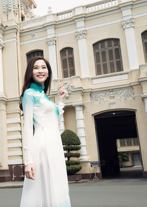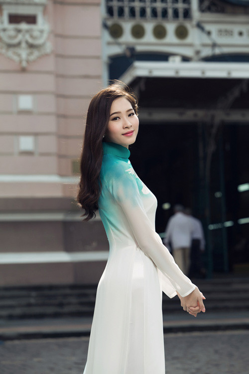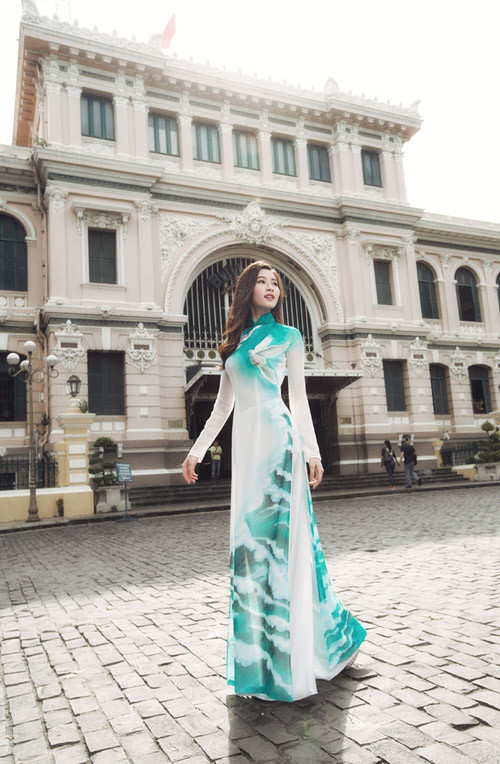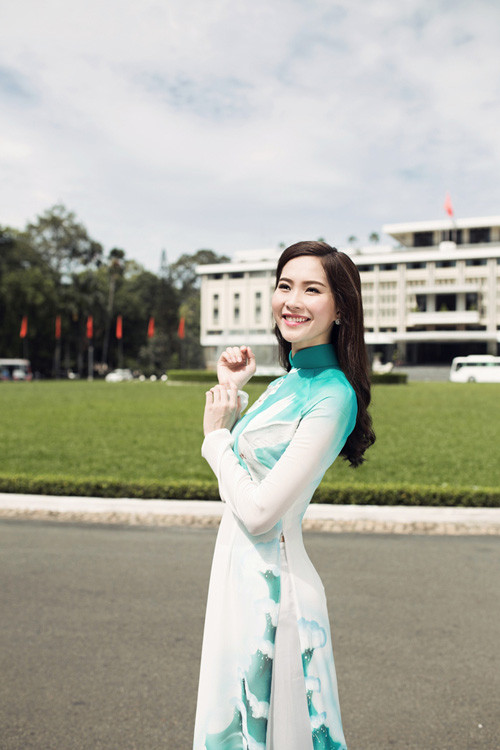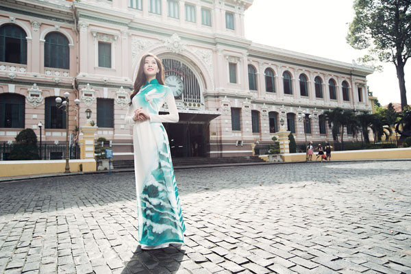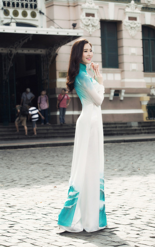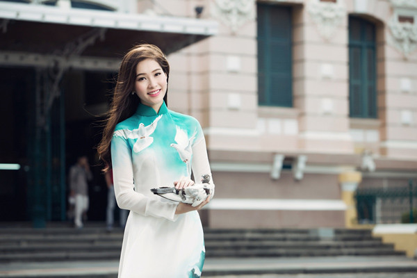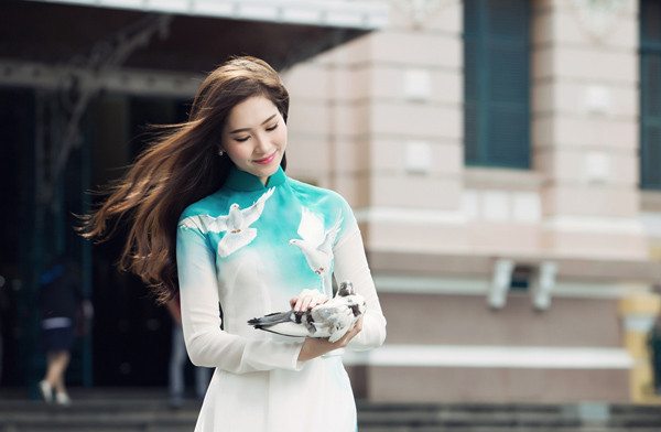 Hoa hậu Đặng Thu Thảo vừa thực hiện bộ ảnh 'Ước vọng hòa bình'. Cô mặc áo dài lụa trắng nền nã với họa tiết sóng biển và chim bồ câu. Toàn bộ họa tiết đều được vẽ 3D bằng tay trông rất sống động.