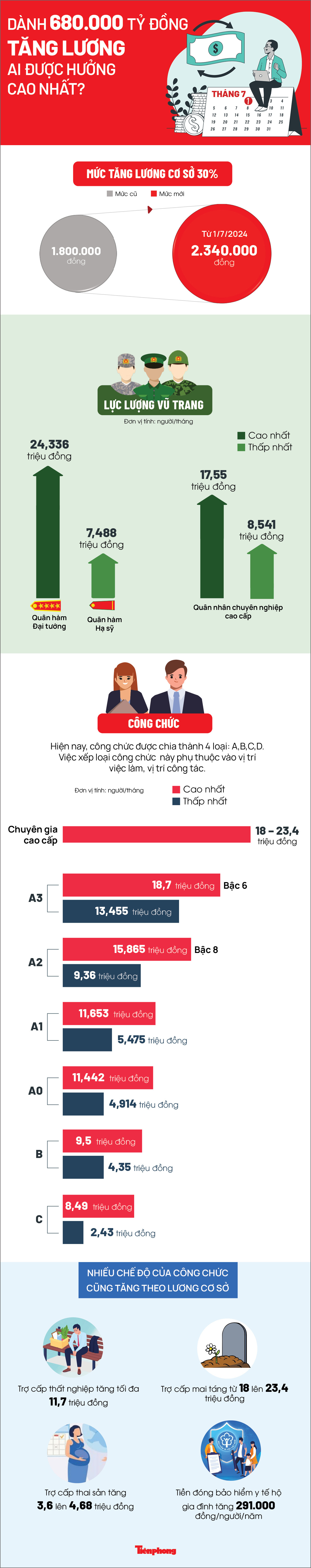 TPO - Chính phủ đã dành khoảng 680.000 tỷ đồng để cải cách tiền lương từ ngày 1/7. Sau khi tăng lương cơ sở 30%, công chức hưởng lương cao nhất ở mức 23,4 triệu đồng/người/tháng.