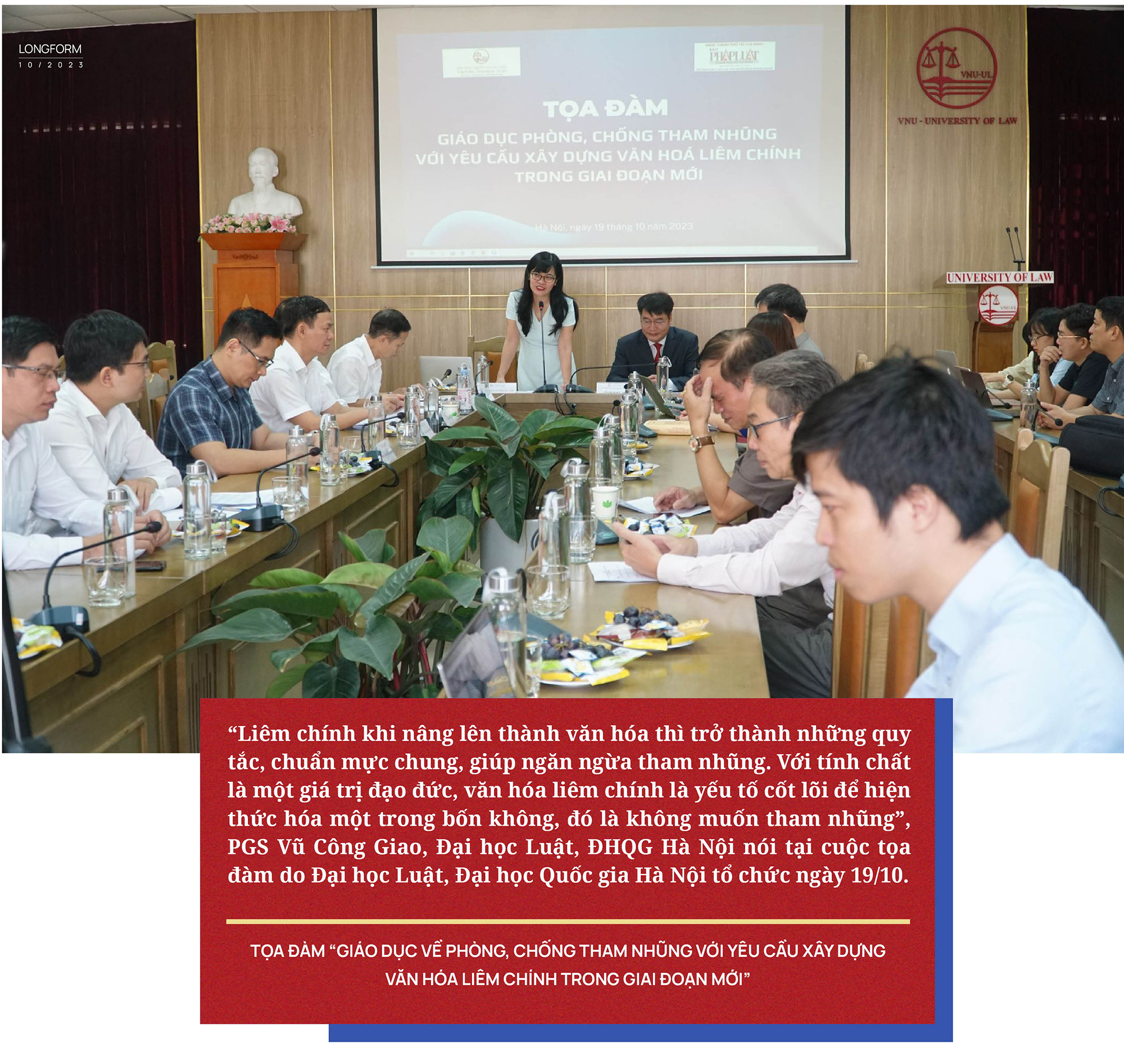 Tại cuộc tọa đàm "Giáo dục về phòng, chống tham nhũng với yêu cầu xây dựng văn hóa liêm chính trong giai đoạn mới", do Đại học Luật- Đại học Quốc gia Hà Nội tổ chức mới đây, các đại biểu cũng đề cao vấn đề xây dựng văn hóa "liêm chính" trong bối cảnh hàng loạt vụ án tham nhũng lớn bị phanh phui, nhiều cán bộ bị xử lý.