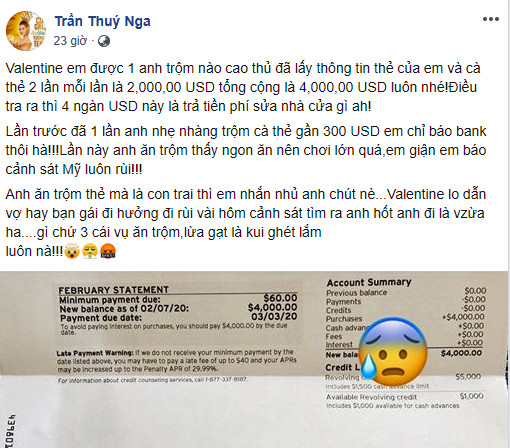 Cụ thể, Thúy Nga viết trên trang cá nhân rằng: “Valentine em được một anh trộm nào cao thủ đã lấy thông tin thẻ của em và cà thẻ 2 lần, mỗi lần là 2000 USD tổng cộng là 4000 USD (gần 93 triệu đồng) luôn nhé! Điều tra ra thì 4000 USD này là trả tiền phí sửa nhà cửa!