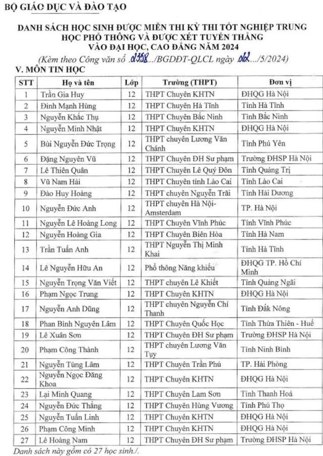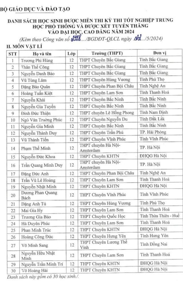 Danh sách các học sinh được miễn thi tốt nghiệp THPT năm 2024 và được xét tuyển thẳng vào ĐH, CĐ năm 2024:
