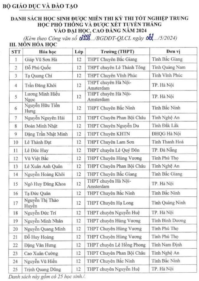 Bộ GD - ĐT đề nghị các sở GD - ĐT thực hiện việc miễn thi Kỳ thi tốt nghiệp THPT năm 2024 theo quy định tại khoản 1 Điều 36 của Văn bản hợp nhất số 01/VBHN-BGDĐT ngày 22/4/2024 của Bộ trưởng Bộ GD - ĐT đối với các thí sinh có tên trong danh sách.