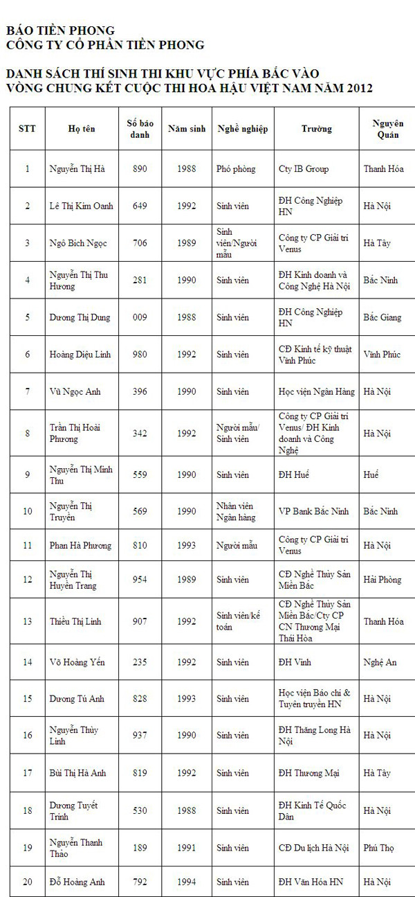 > Danh sách 20 thí sinh phía Nam dự vòng chung kết Hoa hậu Việt Nam