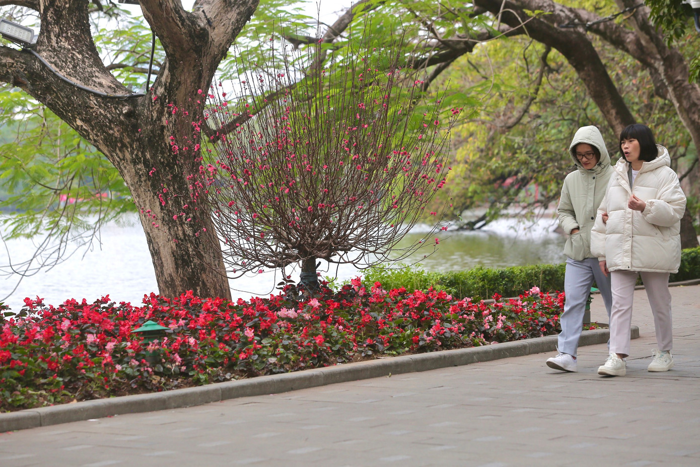 TPO - Bên cạnh thảm hoa tuyệt đẹp, hàng hoa đào bung sắc hồng mang không khí Tết tràn ngập xung quanh hồ Hoàn Kiếm đón Tết Quý Mão 2023