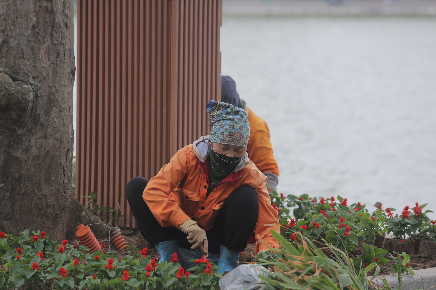 | Thảm hoa được các nhân viên chăm sóc, trồng mời liên tục, giữ màu sắc cho hồ Hoàn Kiếm. |