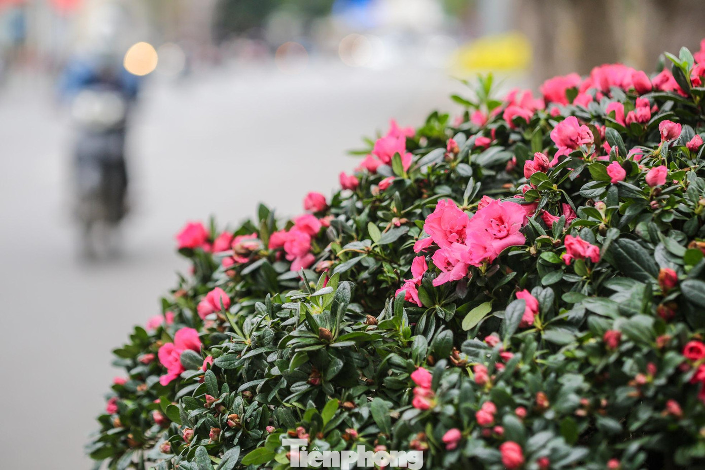 | Hàng trăm cây đào dáng tròn được trang trí giữa các bồn hoa quanh hồ Hoàn Kiếm. |