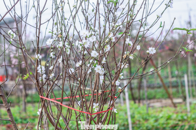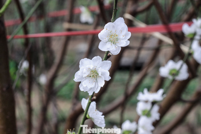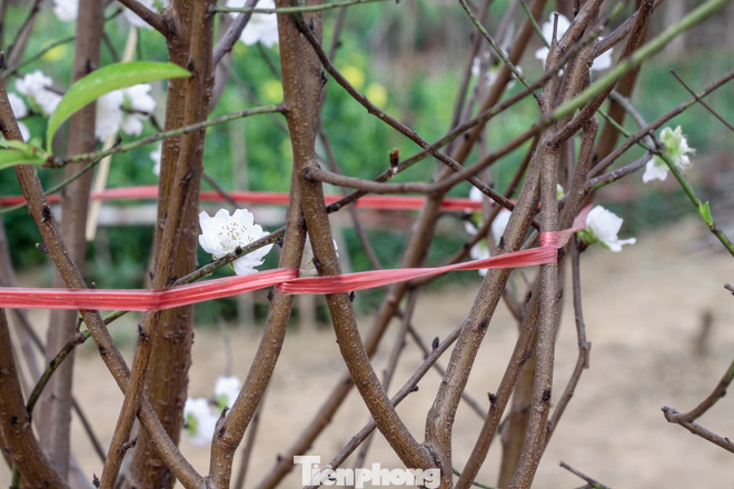 Mặc dù chưa cắt gốc nhưng cành bạch đào cánh trắng vẫn được buộc dây cẩn thận.