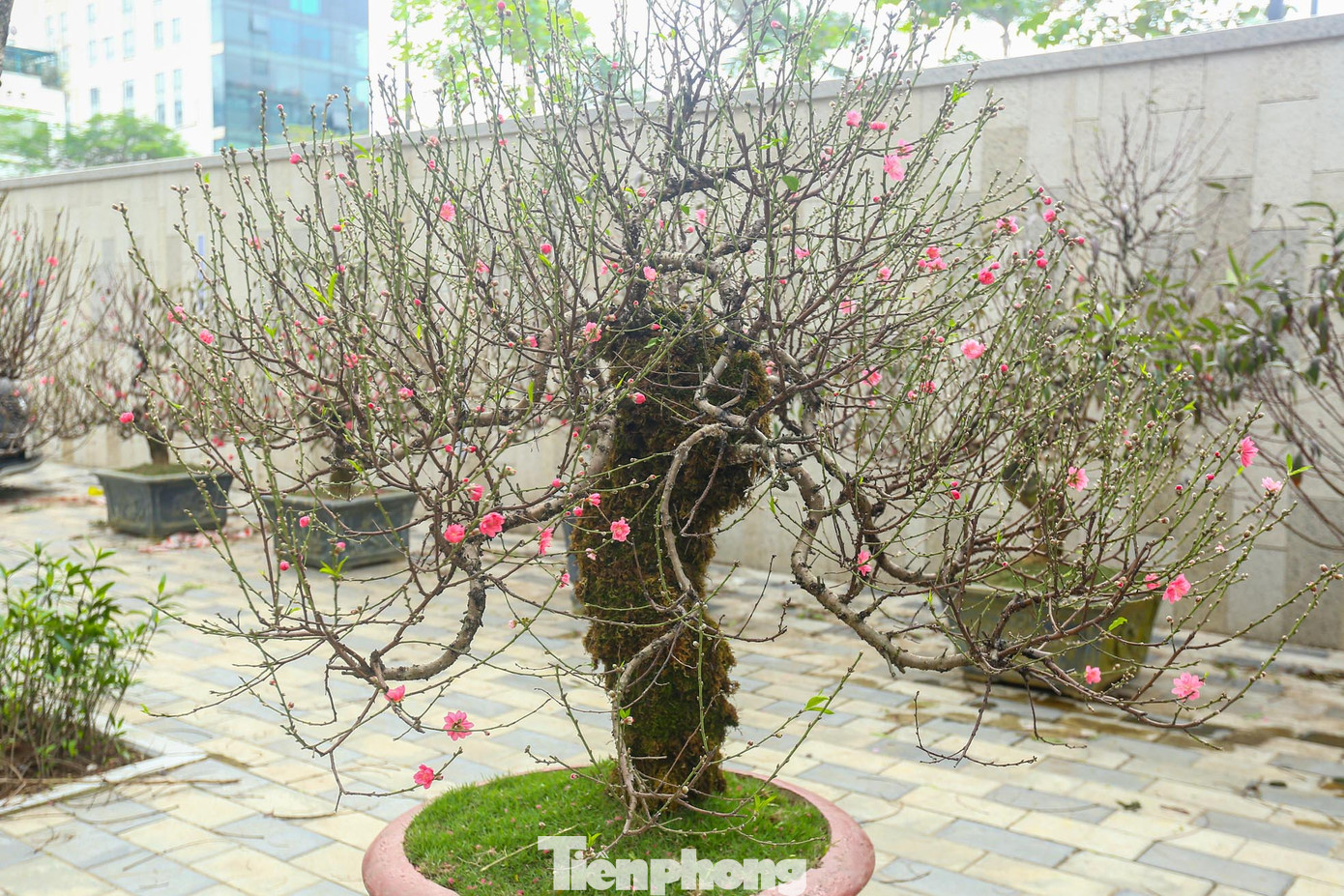 | Hàng đào cổ phủ rêu được chào bán trên vỉa hè đường Lạc Long Quân. |