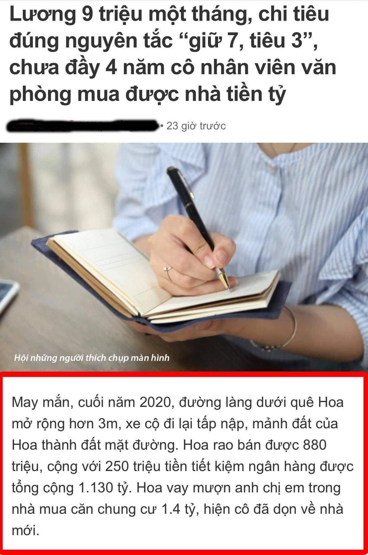 Trước đó, trên mạng xã hội xuất hiện bài chia sẻ của một cô gái 27 tuổi mua được nhà tiền tỷ chỉ sau 4 năm đi làm với mức lương 9 triệu đồng/ tháng. Cụ thể, cô gái trẻ tên H. quê ở Ninh Bình, đã ra trường và bắt đầu đi làm từ năm 2016 với mức lương 9 triệu đồng/ tháng. Với trải nghiệm suốt những năm tháng học hành, ở trọ trên thành phố, H. thấm thía nỗi khổ của cảnh đi thuê nhà. Chính vì thế mà cô bạn đã lên kế hoạch tiết kiệm 70% thu nhập của mình với mục tiêu mua được nhà riêng. Với 9 triệu đồng mỗi tháng kiếm được, H. dùng 30% để chi tiêu cho cuộc sống, sinh hoạt hàng ngày. Như vậy mỗi tháng H. có thể tiết kiệm được 6 triệu đồng. Cộng với tiền làm thêm thi thoảng có được, H. đem toàn bộ gửi ngân hàng. Và chỉ trong vòng 2 năm đầu, cô đã có được số tiền 240 triệu đồng cả gốc lẫn lãi.