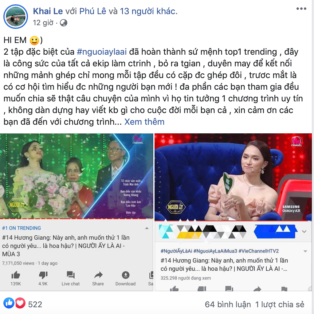 Người Ấy Là Ai đang là chương trình nhận được sự quan tâm không nhỏ của khán giả và liên tục lọt vào Top trending trên YouTube. Mới đây, trong tập đặc biệt của "Người Ấy Là Ai" mùa 3, nữ chính Hương Giang đã lựa chọn anh chàng CEO Matt Liu người Singapore càng khiến cho chương trình hẹn hò này càng trở nên hot hơn bao giờ hết.