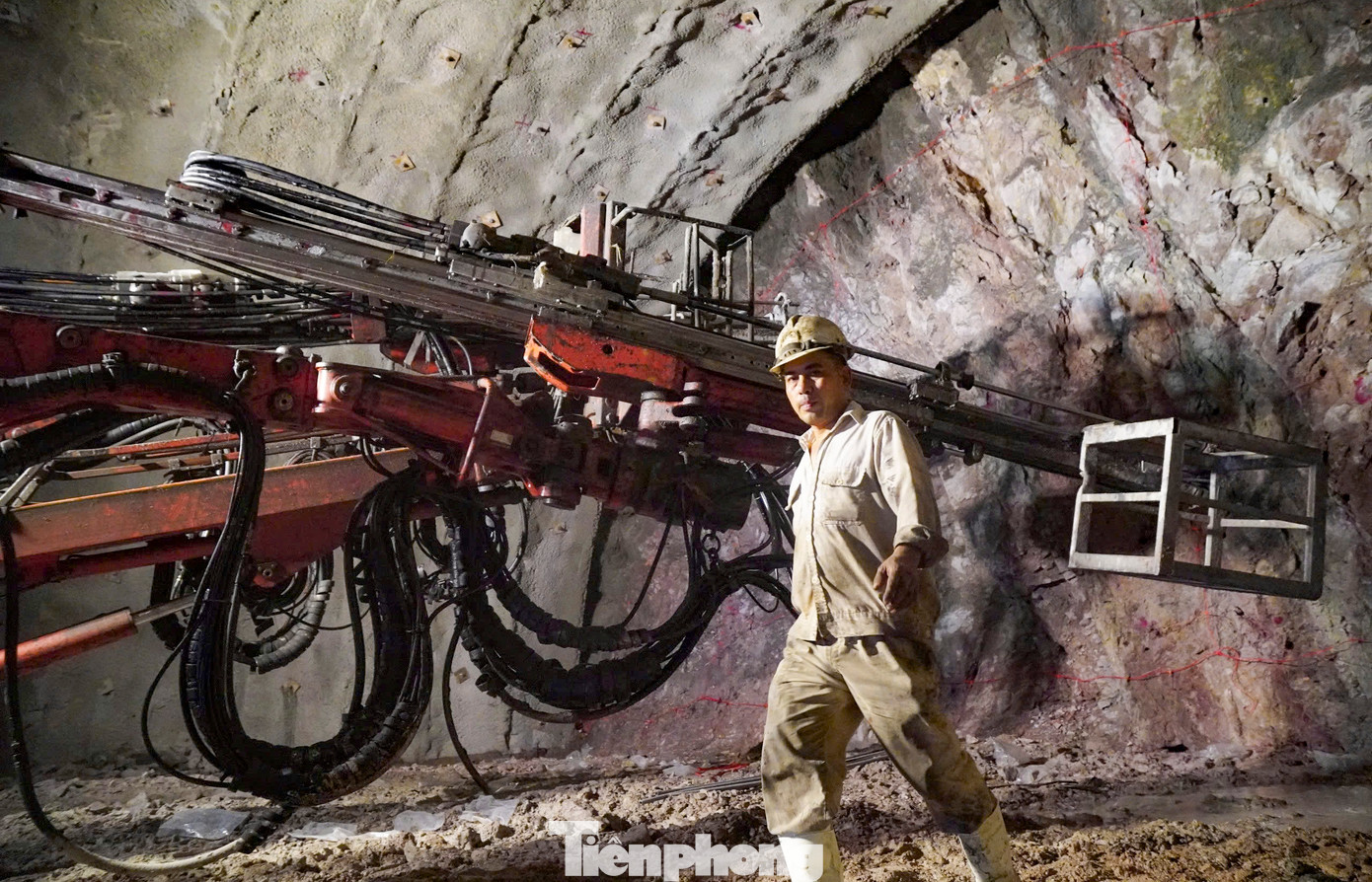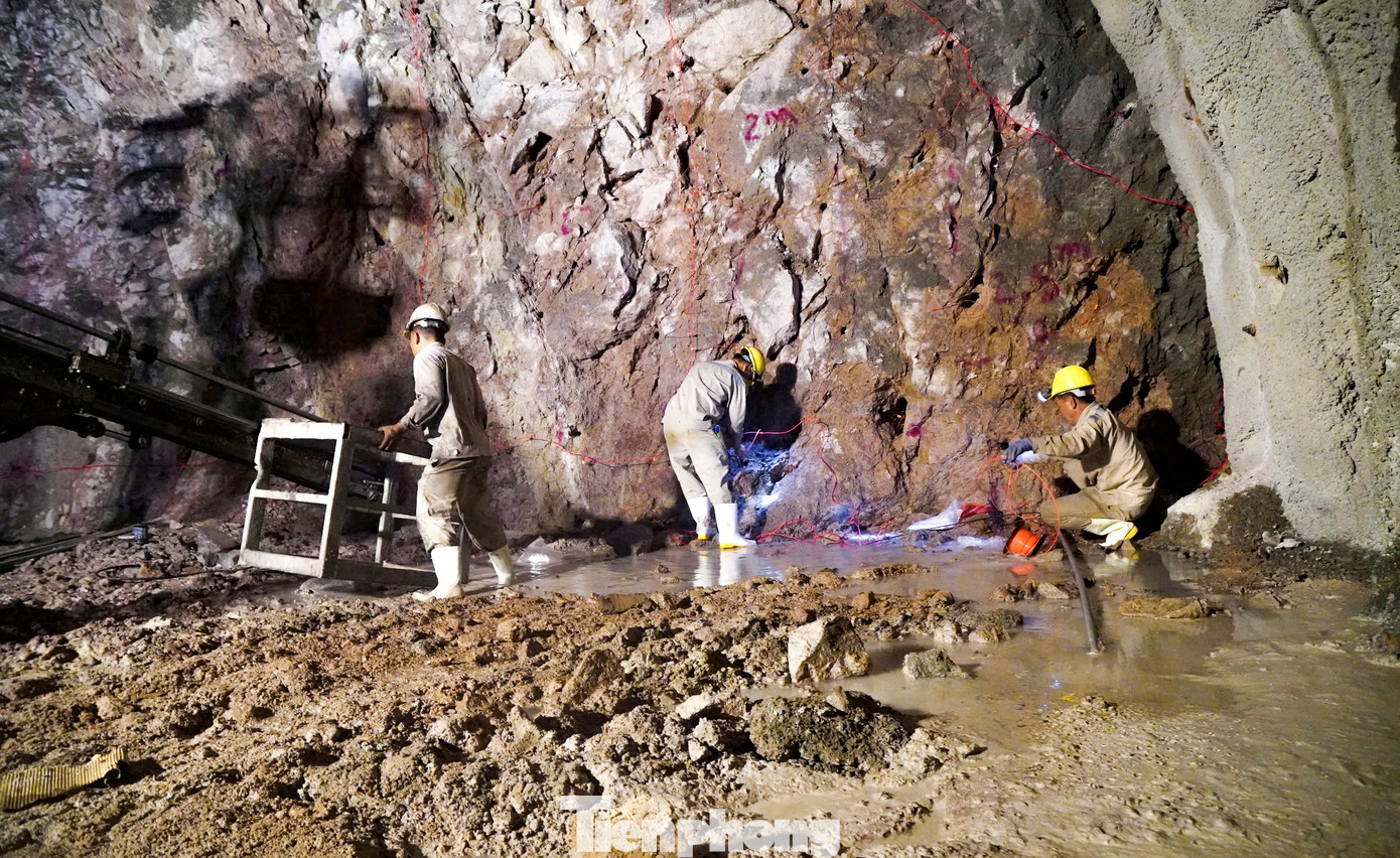 Tại khu vực thi công sâu trong cửa hầm, các công nhân, kỹ sư nỗ lực khoan từng mét đá núi rồi phá dỡ đất đá bằng thuốc nổ. Ảnh: T.Đ