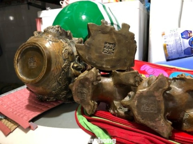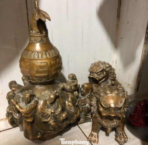 Anh T.Q cho biết: Khi dùng nước rửa sạch những cục đất sét, phát hiện những bức tượng đồng hình thổ địa, kỳ lân, bình hồ lô... Trên những bức tượng khắc hoa văn sắc sảo, dưới đế có khắc chữ Hán. Tuy nhiên, có thể do thời gian dài bị chôn dưới đất nên chữ phai dần. “Tôi thật sự rất bất ngờ khi thấy các bức tượng này. Tượng hai con kỳ lân bằng đồng nhìn rất dũng mãnh. Còn tượng thần thổ địa có phong thái. Thật sự tôi cảm thấy rất may mắn khi sở hữu những vật vừa được phát hiện”, anh Q. nói.