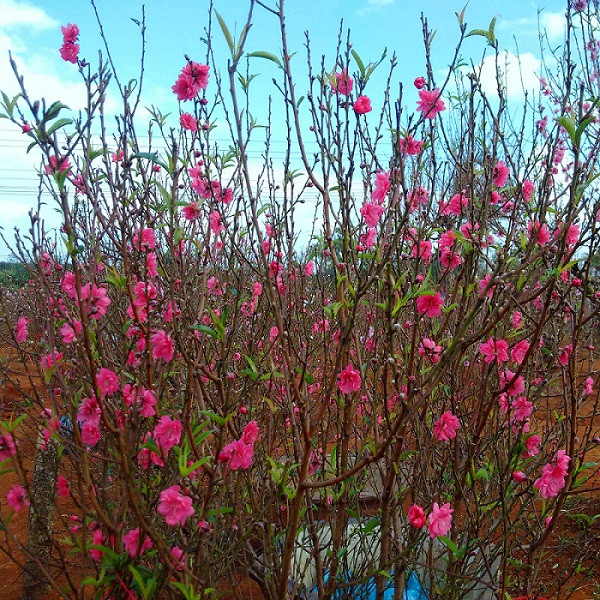 Chị Duyên chăm sóc vườn đào phục vụ Tết Hiện các hộ ở tổ dân phố Tân Hà 3 chủ yếu trồng đào từ 1 - 2 năm là bán bởi lượng khách hàng lớn, trồng đến đâu người mua hết đến đó. Cả vùng chỉ có vài chục gốc đào cổ thụ (từ 5 - 20 năm) được khách gửi chăm sóc hoặc để bán. Thời điểm giáp tết lượng khách không chỉ trong tỉnh mà các tỉnh khác như: Gia Lai, Kon Tum, TP. Hồ Chí Minh… cũng tìm đến vườn mua.