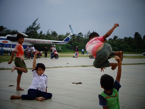 | Sân bay dã chiến trên đảo nhộn nhịp quân dân, không khí vui như Tết mỗi khi có trực thăng Trung đoàn không quân 917 hạ cánh. Còn ngày thường nó là sân chơi của trẻ em. |