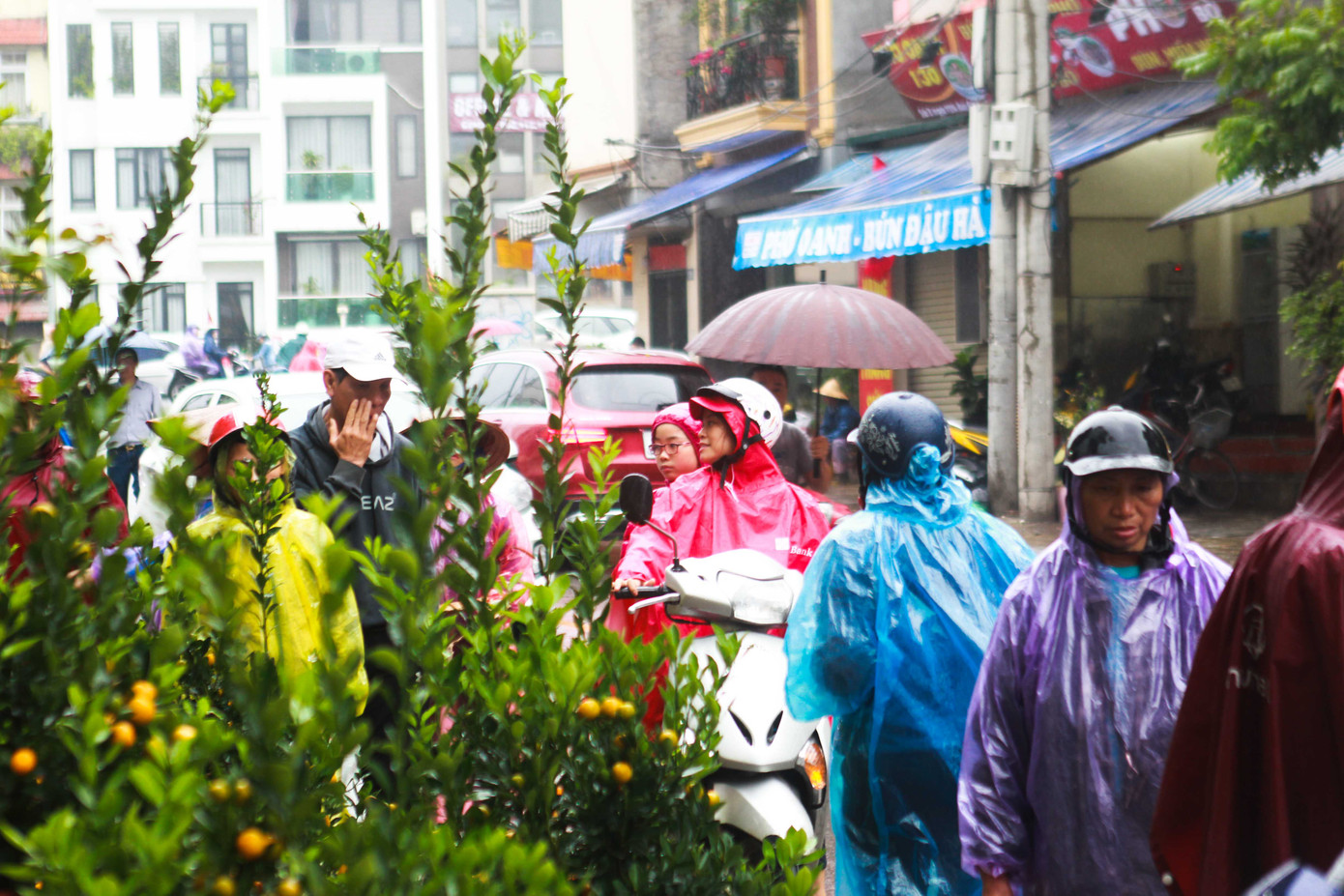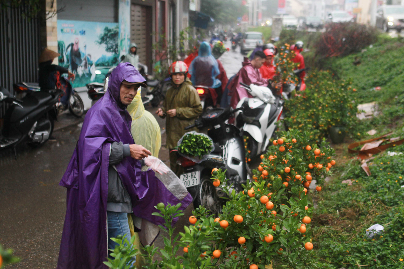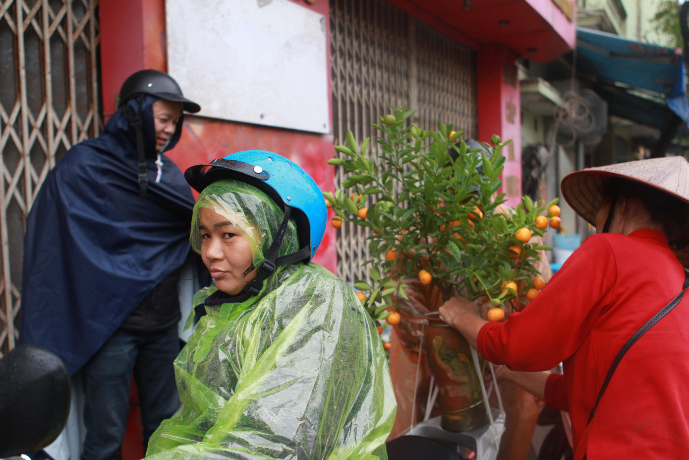 "Chiều 30 rồi, kiểu gì quất cũng phải bán rẻ nên dù trời mưa vẫn mình tranh thủ đi kiếm một cây chơi Tết", một người mua quất cho biết