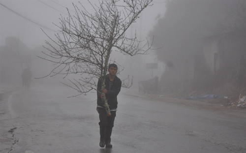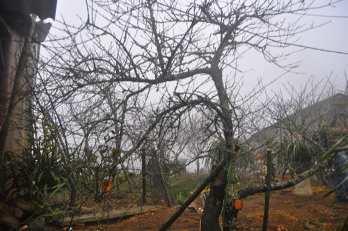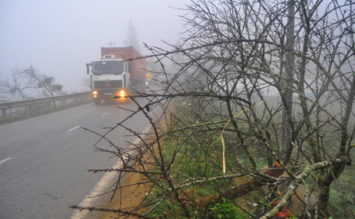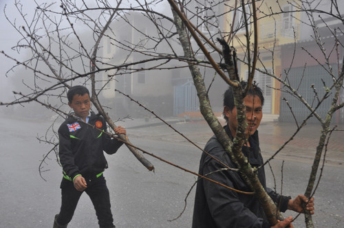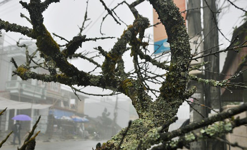 Những cành đào rừng xù xì, rêu phong và có cây tầm gửi, ký sinh đang được người dân miền cao đem bán tại các phiên chợ.
