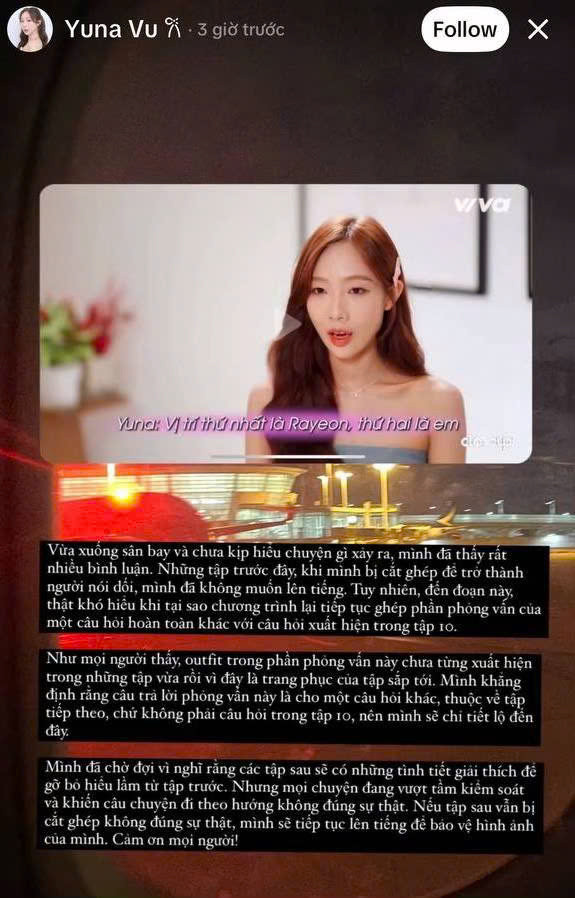 Ít giờ sau khi phát sóng, Yuna Vũ lên tiếng về sự việc trên trang cá nhân. Cô cho biết mình bị cắt ghép ác ý trong các tập trước. Ở tập 10, phân đoạn trả lời gây tranh cãi là của một câu hỏi hoàn toàn khác trong tập tiếp theo. Nữ TikToker cho biết cô lên tiếng để bảo vệ hình ảnh của mình khi "mọi chuyện đang vượt tầm kiểm soát", "đi theo hướng không đúng sự thật".