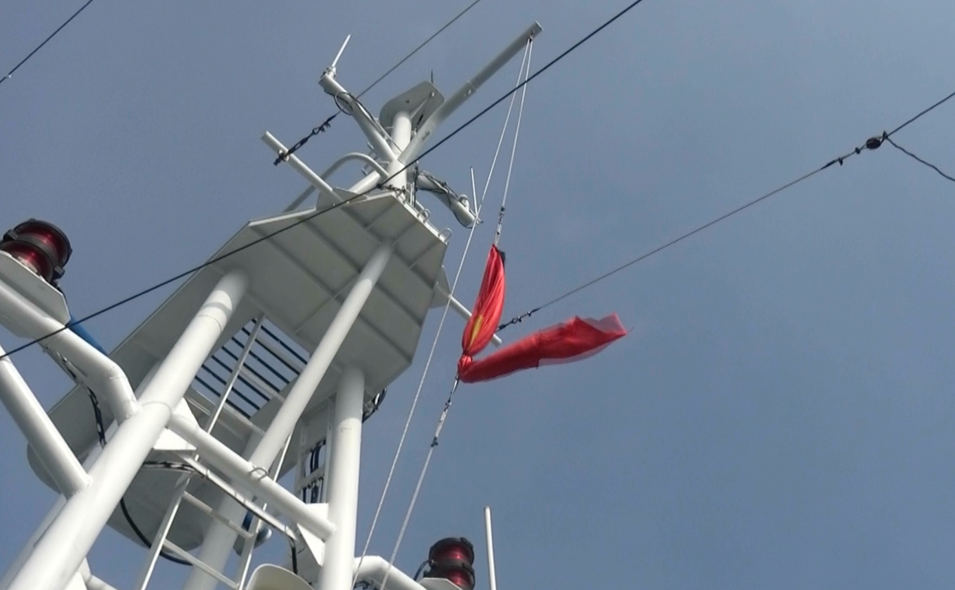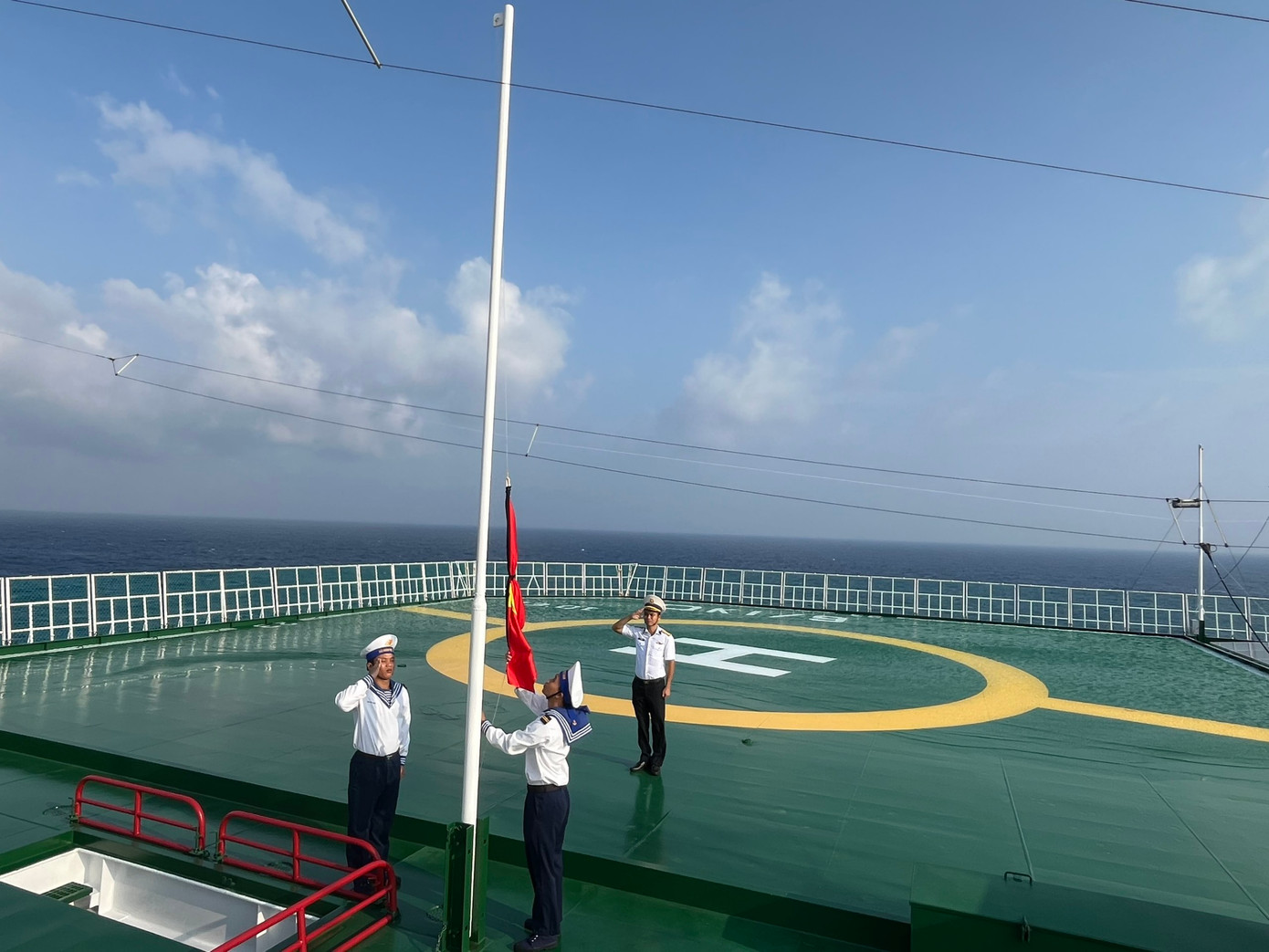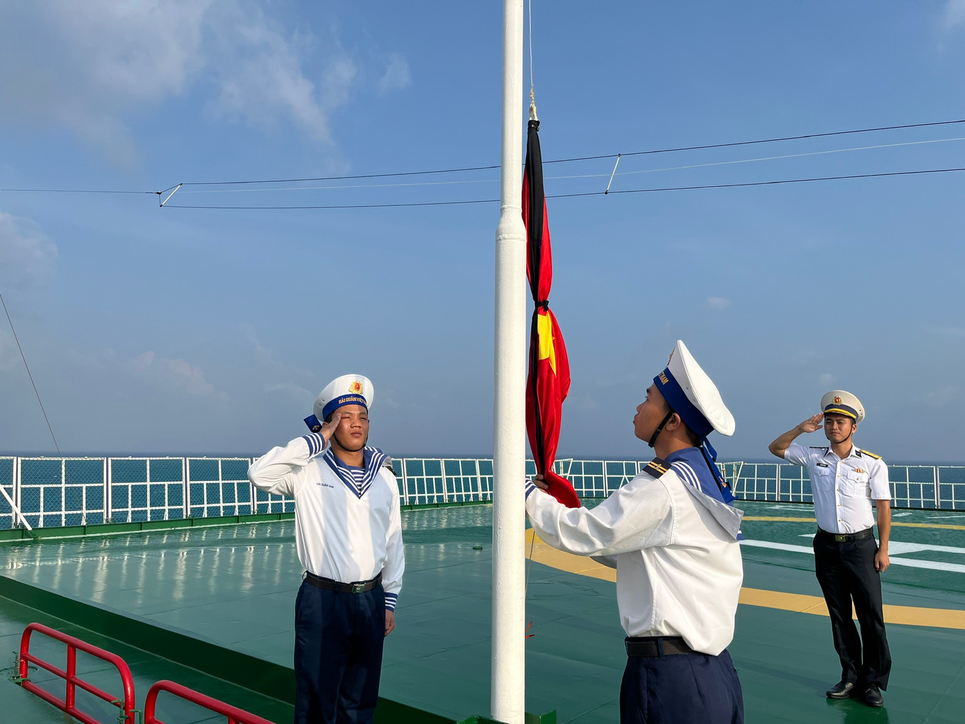Tàu Kiểm ngư 475 (đang ứng trực trên vùng biển Trường Sa) treo cờ rủ.