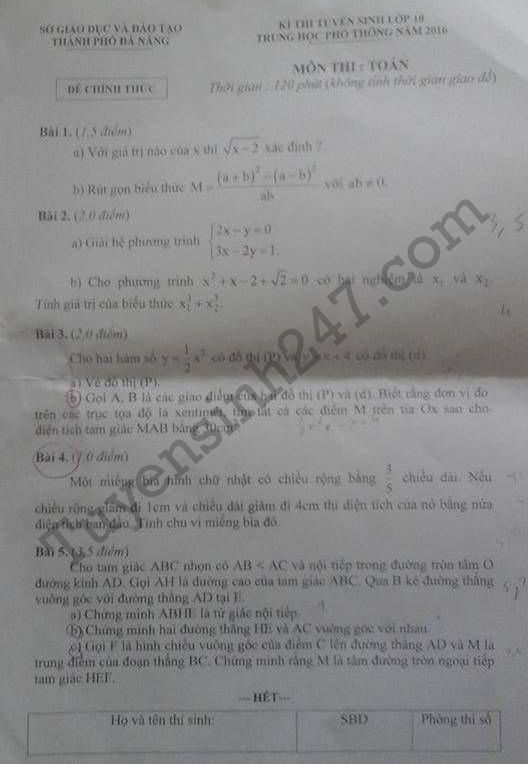 Đáp án đề thi vào lớp 10 môn Toán ở Đà Nẵng