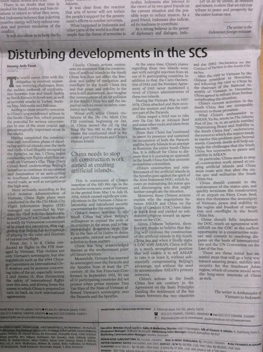 Phản bác lại những lập luận mị dân của Đại sứ Xu Bu, ngày 25/1, cũng trên tờ Jakarta Post, Đại sứ Việt Nam tại Indonesia Hoàng Anh Tuấn có bài viết với tiêu đề “Các diễn biến mới đáng lo ngại ở Biển Đông” đã đưa ra những thực tế trái ngược hoàn toàn với những tuyên bố của Đại sứ Xu Bu.