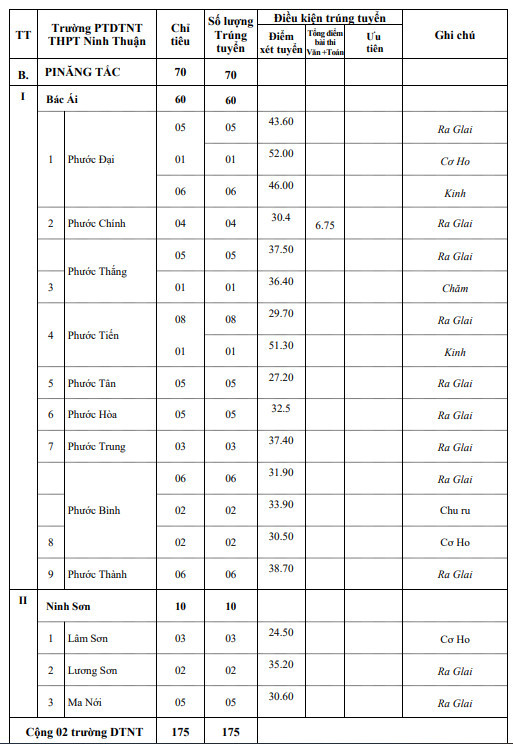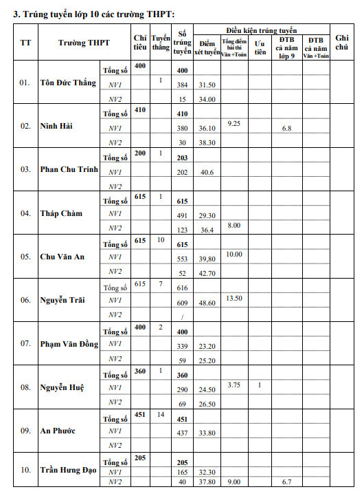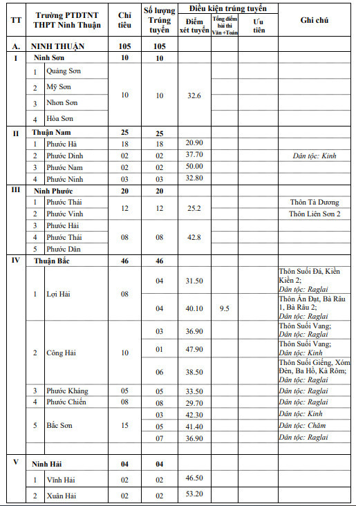 Kết thúc kỳ thi, tỉnh Ninh Thuận có 3 trường THPT có điểm trúng tuyển nguyện vọng 1 dưới 18 điểm gồm: Nguyễn Du (16,5 điểm), Bác Ái (17,1 điểm) và Nguyễn Văn Linh (17,5 điểm).