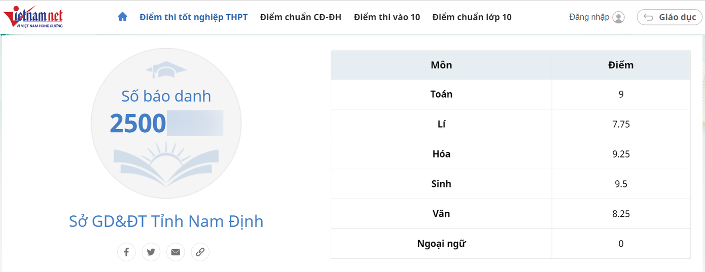 Một trường hợp khác cũng ở Nam Định, đạt 27,45 điểm khối A00 và 25,7 điểm khối B00 nhưng vẫn bị 0 điểm tiếng Anh. Em này đạt 9,2 điểm Toán, 8,75 Lý, 9,5 Hóa và 7 điểm Sinh.